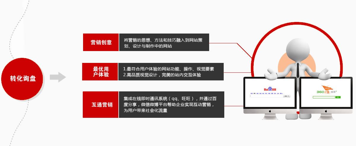 根据产品和客户群,精心策划网页布局和广告文案,突出产品优势,塑造企业公信力、客户见证,为潜在目标客户答疑等,通过网站营销贯彻,增加销售机会,最终获得成交。